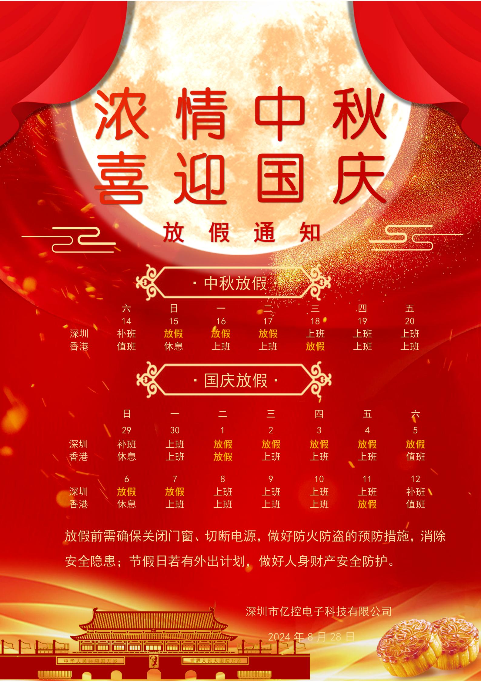 深圳:中秋節(jié)9月15日至9月17日放假,共3天;國慶節(jié)10月1日至10月7日放假,共7天 香港:中秋節(jié) 9月18日放假,共1天;國慶節(jié)10月1日放假,共1天 請各位顧客、供應商,請?zhí)崆鞍才藕貌少彙⒐┴?、付款計?