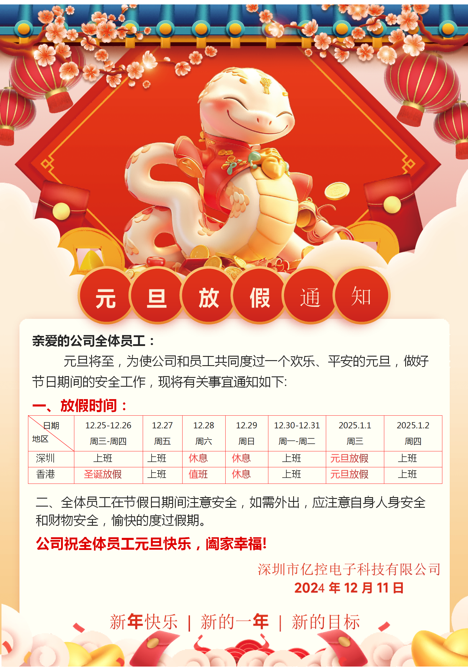深圳:2025年1月1日 放假 香港:2024.12.25-12.26、2025.1.1 放假 請各位顧客、供應(yīng)商,請?zhí)崆鞍才藕貌少?、供貨、付款計?/span>